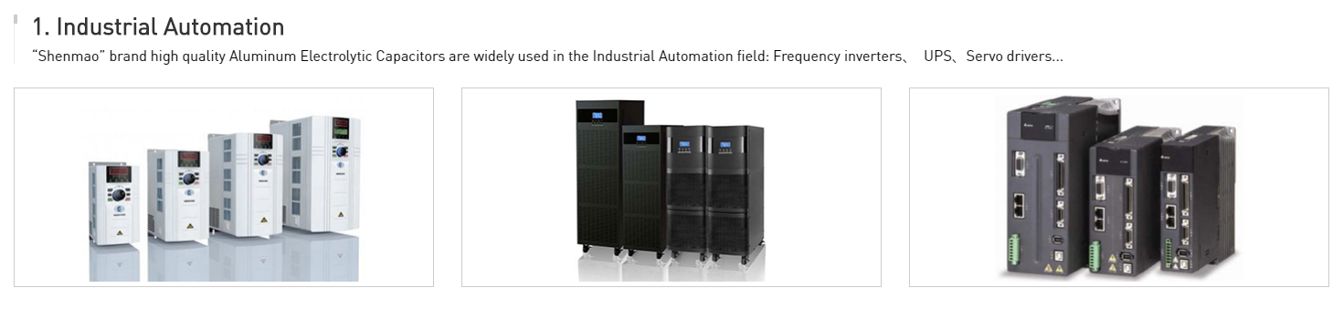 "Shenmao" Capacitors are widely used in the Automazione industriale, telecomunicazioni, elettronica di consumo, attrezzature di sollevamento, elettrodomestici, trasporti, nuove energie, ecc.